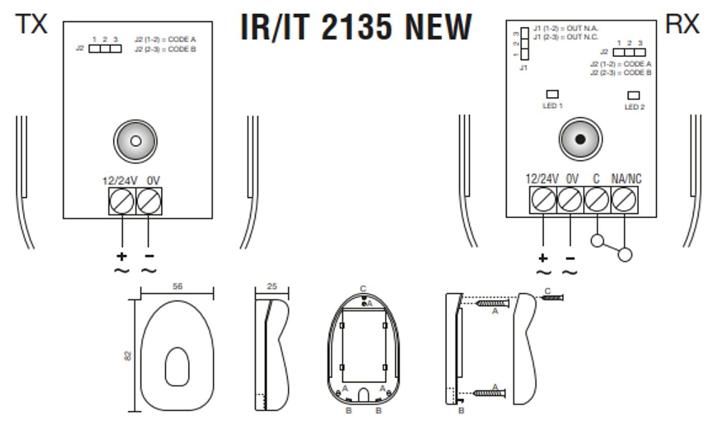 Ο δέκτης (RX) μπορεί να τροφοδοτηθεί με 12 ή 24V, με συνεχές ή εναλλασσόμενο ρεύμα – προσοχή στην πολικότητα (+/-).